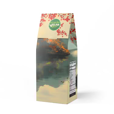 The High Lakes Coffee Blend features a stunning art-inspired package design that captures the serene beauty of nature with a minimalist depiction of tranquil lakes and almond trees. Its vivid red and gold hues echo the invigorating flavors inside, making it a delightful gift for both coffee aficionados and art enthusiasts.